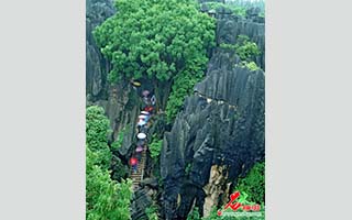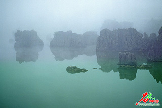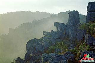 然而,在特定的气候条件下,如阴日、日出之际和夕阳西下,夜幕拉开之后,月光之下,石林却展现出阴柔温婉的一面,特别是在雾霭天气,更是犹如身披轻纱的少女,婀娜多姿,仪态万方。这时,如身置高处,但见群峰尽在朦胧迷茫之中,寻常耸立的刚劲石峰,此时此刻竟脱胎换骨,变成一群群漫步闲游的九天仙女,天上人间溶为一体,极尽柔美之情境。